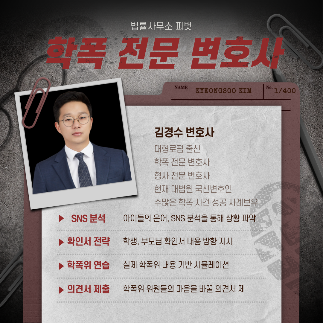 | [학폭 토막상식 14편] 학폭위 조사관 학교폭력 조사받을 때, 부모님이나 변호사 같이 들어가도 되나요? (0) | 2025.05.07 |