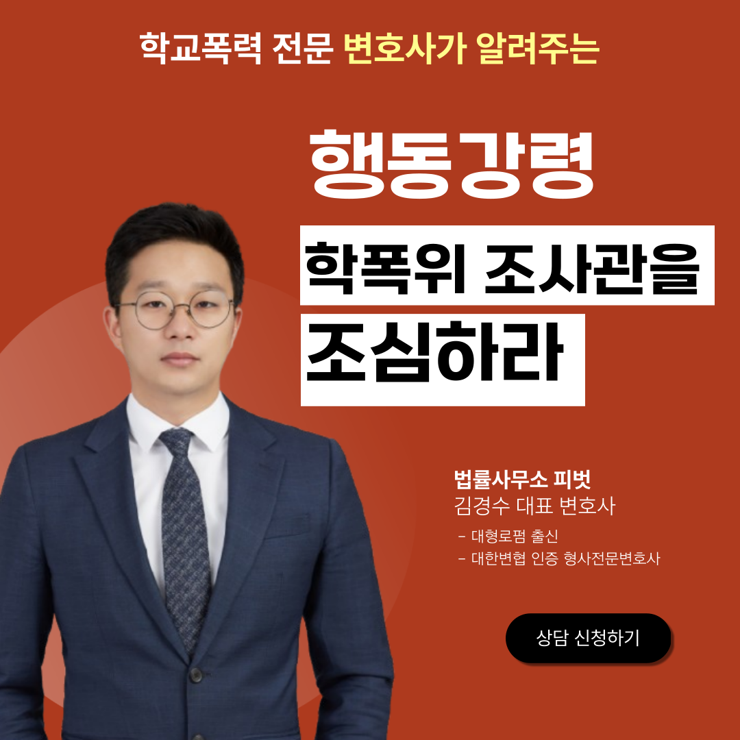 | [학폭 토막상식 14편] 학폭위 조사관 학교폭력 조사받을 때, 부모님이나 변호사 같이 들어가도 되나요? (0) | 2025.05.07 |